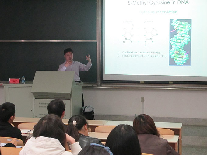 钱伟强研究员1979年出生,以第一作者在《Science》、《Mol Cell》、《Plant Cell》上发表高质量学术论文多篇,主要研究方向为DNA去甲基化途径和转座子对附近基因的表达调控。他围绕鉴定参与DNA去甲基化的酶和筛选去甲基化调控的因子以及表观遗传学信息对基因的表达调控等内容为生命科学学院师生做了《植物中DNA去甲基化的分子机制》的学术报告。
