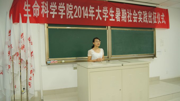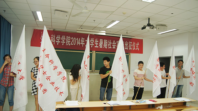 首先,葛云老师向我们介绍了实践总体安排,跟同学们剖析了此次实践的深刻意义及其无可厚非的价值。随后,继张鹏同学宣读社会实践团队名单,由院领导为暑期实践团队庄严授旗并合影留念。接下来,许玮月同学作为学生代表发言,她字字铿锵,无不契合于我们此刻激动的心情。最后,胡春花书记对我们整个团队提出了几点要求,重申了安全问题的重要性,传达了我院对同学们的殷勤期望和对此次实践的重视,给予了同学们精神、资金的双重支持;并郑重宣布我院2014年暑期社会实践正式启动。
