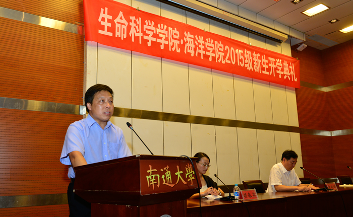 副院长姚登兵代表全院教职员工热烈欢迎2015级新同学的到来,介绍了南通大学和生命科学学院、海洋学院的概括及近年来取得的主要成绩,并向新同学提出“学会学习、学会思考、学会生活”的三点希望。