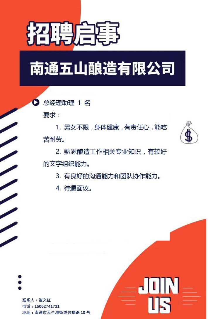 南通五山酿造有限公司招聘启事