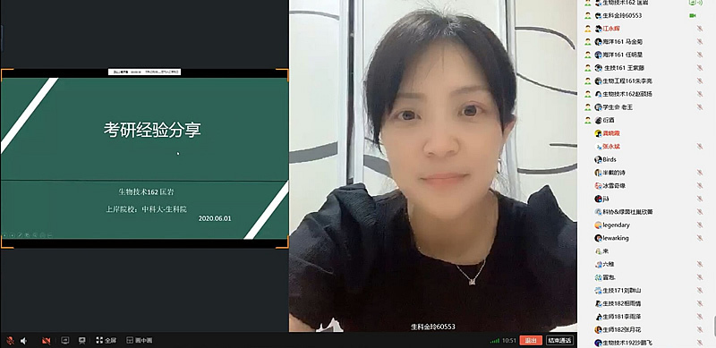 为帮助我院学子明确考研目标,发挥传帮带作用,营造积极向上的优良学风,6月1日晚,生命科学学院团委、学生会举办了“考研路上 指路明灯”考研经验云端分享会,6位大四毕业生应邀进行在线考研经验分享。学院党委副书记、副院长金玲主持活动,近200名17、18级备考和意向考研学生参加了分享会。