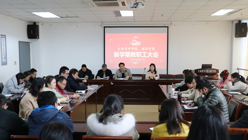 2月27日下午,生命科学学院召开新学期教职工大会,学习传达校教代会、工代会精神,回顾2020年工作、分析学院发展形势、部署2021年重点工作。全体教职工参加会议,院长姚登兵主持会议。
