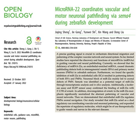五、血管网络和神经系统的定向迁移受到机体非常复杂和精准的调控,miRNA在这一过程中发挥重要功能,我们发现miRNA-22在内皮细胞富集,其表达的缺乏会导致斑马鱼胚胎节间血管和初级运动神经元的显著寻路缺陷,导致初级运动神经元的轴突缺陷,Sema4c是其潜在的靶点,研究表明miRNA-22是协调血管和神经元模式的双重调控因子,为血管和神经治疗提供了线索。相关研究于2022年4月发表在《Open Biol》。