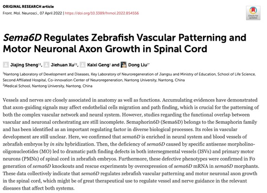 六、血管与神经在解剖学和功能上都密切相关,但其协调功能的研究仍有待完善。Sema6D是多种生物过程的调节因子,研究发现该基因在斑马鱼血管和神经系统中富集表达,而Sema6D的缺乏会引起斑马鱼胚胎脊髓节间血管和初级运动神经元的缺陷。相关研究发表于2022年4月在《Frontiers in Molecular Neuroscience》。