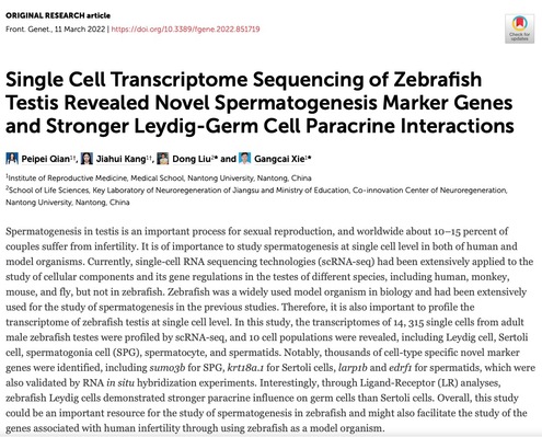 四、睾丸中精子的发生是有性生殖的重要生物过程,斑马鱼作为常用的模式生物,研究其精子的发生具有重要的科学意义,文章对成年雄性斑马鱼睾丸进行了单细胞转录组测序分析,鉴定出多个细胞群以及特异性的新标记基因,为研究精子发生提供了重要的参考。相关研究于2022年3月发表在《Frontiers in Genetics》。