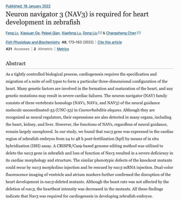 二、心脏的形成是受到严格调控的生物学过程,多种因素参与了心脏的形成。我们发现敲除斑马鱼的NAV3基因会导致心脏发育受阻,表明NAV3参与了心脏形态结构的发生,相关研究成果于2022年1月发表在《Fish Physiology and Biochemistry》。