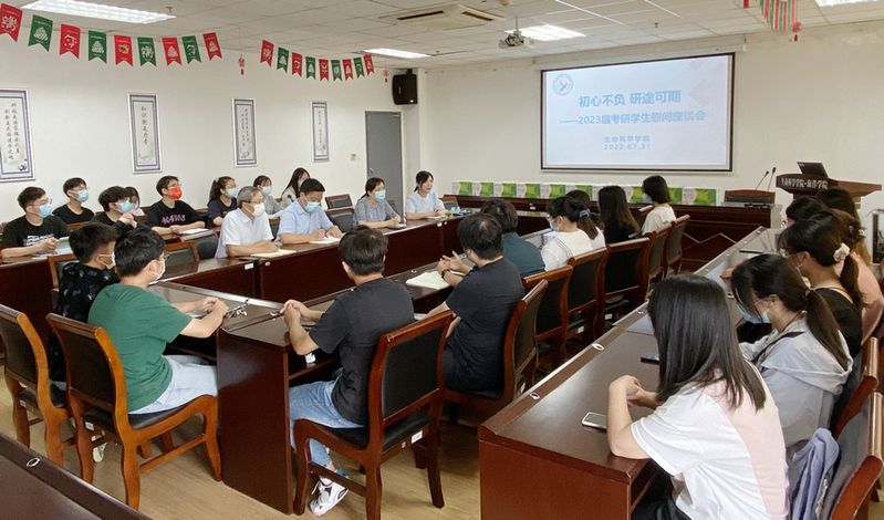 7月31日上午,生命科学学院召开“初心不负,研途可期”暑期留校考研学生慰问座谈会。院党委书记季凌燕、院长姚登兵、副院长邓自发参加座谈会,院党委副书记、副院长金玲主持会议。