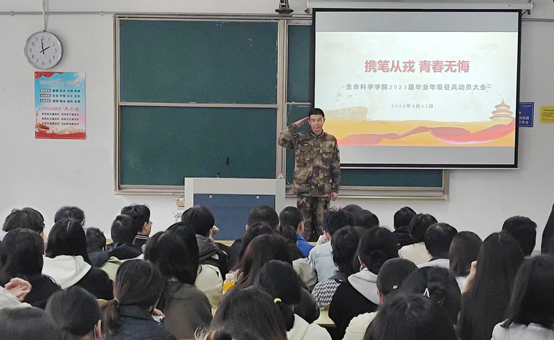 4月23日下午,生命科学学院召开2023届毕业生年级征兵动员大会暨基层就业政策宣讲会。校人武部张青国老师应邀作征兵政策宣讲。