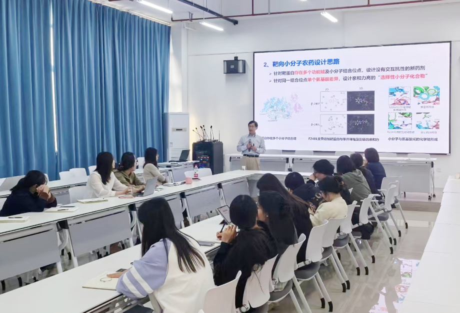 周教授深入浅出的介绍了农药与靶标的概念、杀菌剂新靶标的发现、研究现状、药物与靶标的关系。他通过案例分析和数据支持,详细阐述了靶向小分子农药设计的思路、靶向农药的重要性和应用价值。周教授还亲切地跟我们分享了如何做科研、如何深入研究。在场的老师和研究生们积极参与,与周教授进行了热烈的互动和交流。他们就自己在研究中遇到的问题和困惑向周教授请教,得到了耐心的解答和指导。