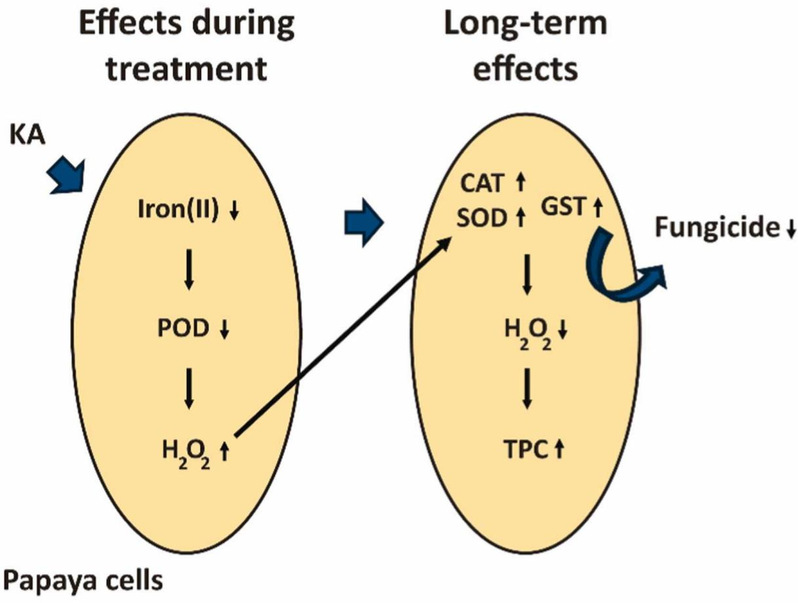 该研究首次揭示了天然代谢产物曲酸通过诱导木瓜tau类谷胱甘肽S-转移酶(GSTs)表达,从而显著促进多种杀菌剂降解的分子机制。通过螯合亚铁离子降低POD活性,导致H₂O₂短期积累,继而诱导一系列抗氧化酶(如CATSODGST)表达,增强了解毒能力。研究表明,2 mM曲酸可将嘧菌酯、百菌清、恶咪唑等9种常用杀菌剂的降解率在5天内提升至40%95%以上。