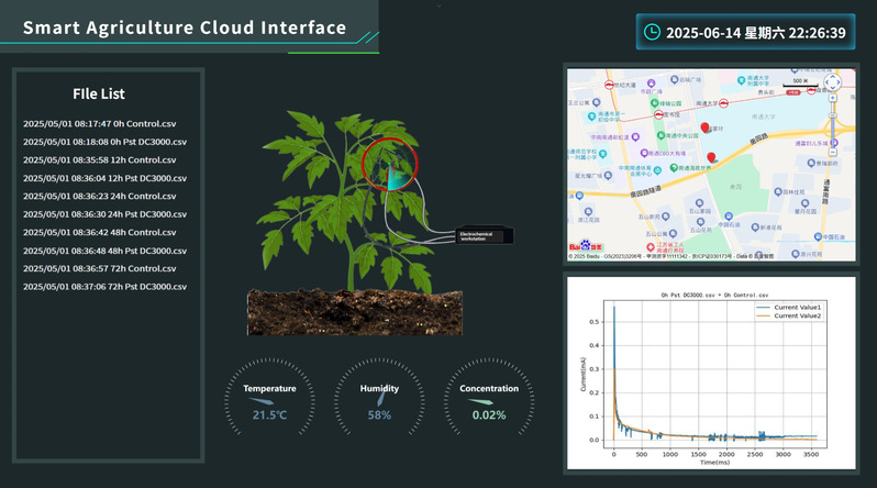 该研究开发了一种基于智能手机的电化学微传感器系统,结合物联网技术,实现了对植物体内水杨酸的远程实时监测。水杨酸是植物健康的"晴雨表"。传统检测方法如色谱分析需要复杂的样品前处理,无法实现田间实时监测以及数据的远程传输。研究团队首次将智能手机电化学检测技术拓展至植物激素信号监测领域创造性地将微型三电极传感器、智能手机的移动计算和传输能力与物联网(IoT)技术相结合,构建了一套完整的水杨酸远程监测系统具有便携性(传感器直径仅头发丝粗细)、实时性(无需样品预处理)和智能化(数据云端共享)三大优势。该技术框架可扩展至其他植物激素如茉莉酸、脱落酸的监测,为构建基于植物信号分子的早期预警系统奠定了基础。未来通过优化传感器阵列,有望实现对多种植物激素的同步监测,推动智慧农业从"表型观察""分子预警"的跨越式发展。